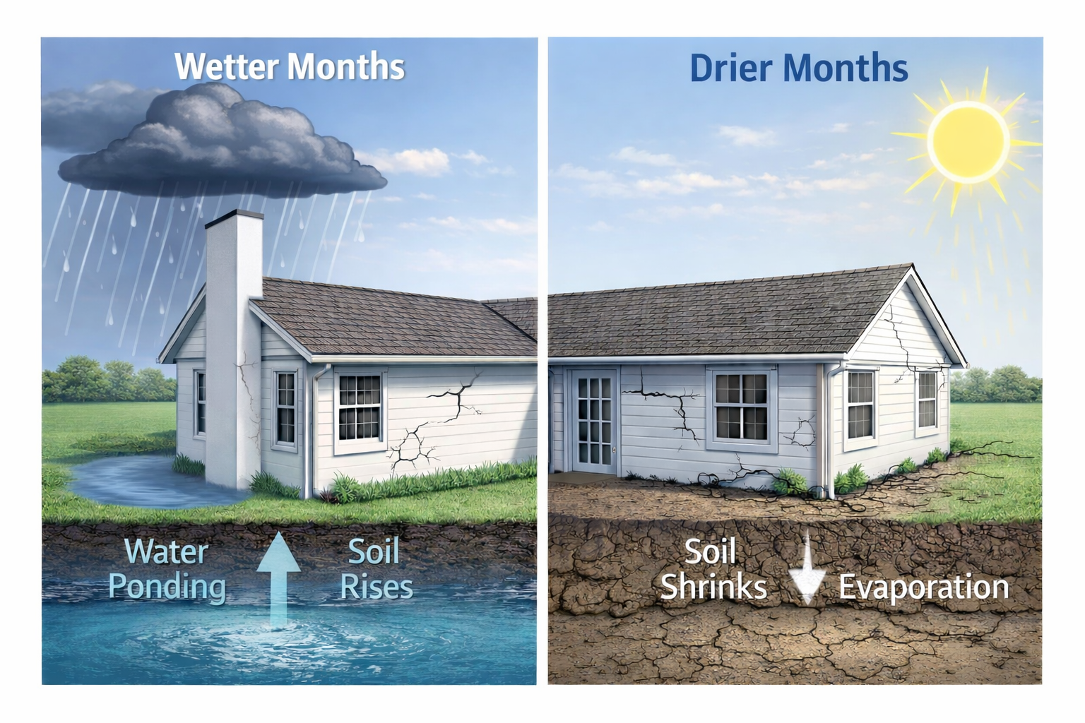 Your house is founded on highly plastic clay soils. The highly plastic clay soils are characterized as very expansive or possessing high shrink-swell potential. Simply, these expansive soils have the ability to shrink and swell when dry and swell to a large volume when wet. Seasonal moisture variations, vegetation, and precipitation pattern directly affect this sponge-like behavior. In Texas, the clay typically swells in the winter and spring (wet months) and shrinks in the summer and fall (dry months).